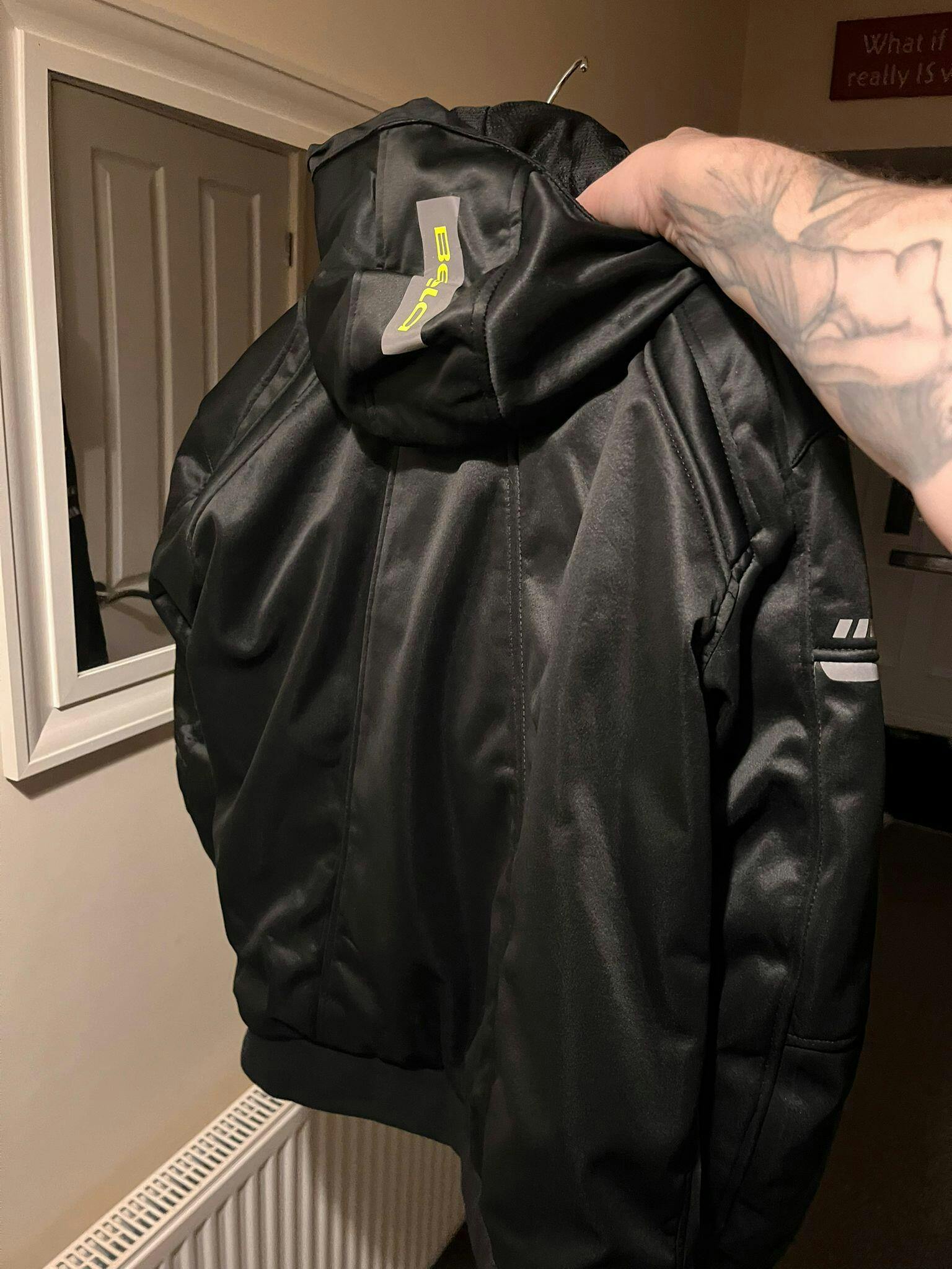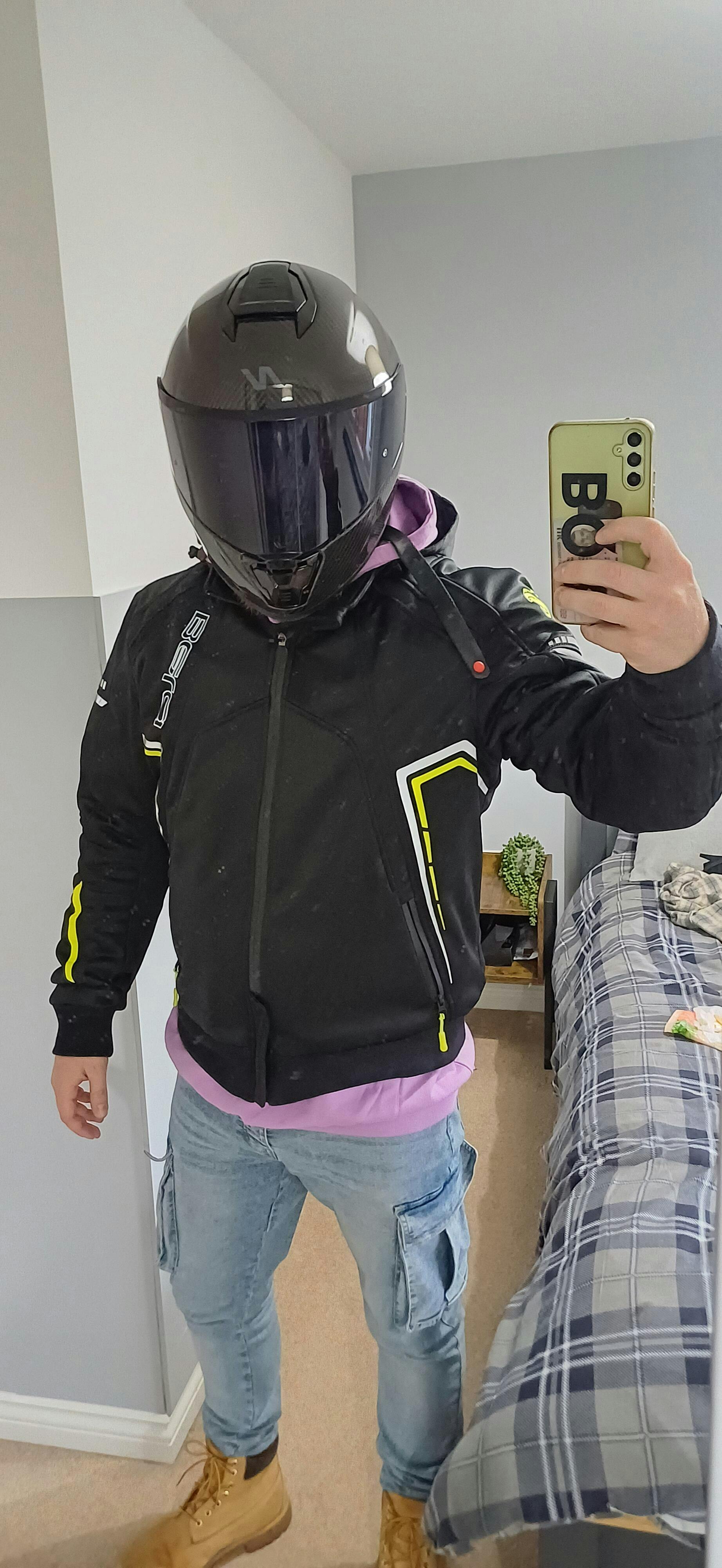 It is an armoured hoodie with pockets for removable armours at elbows, shoulders, and back. The jacket is compliant to EN 17092-4:2020 standards.