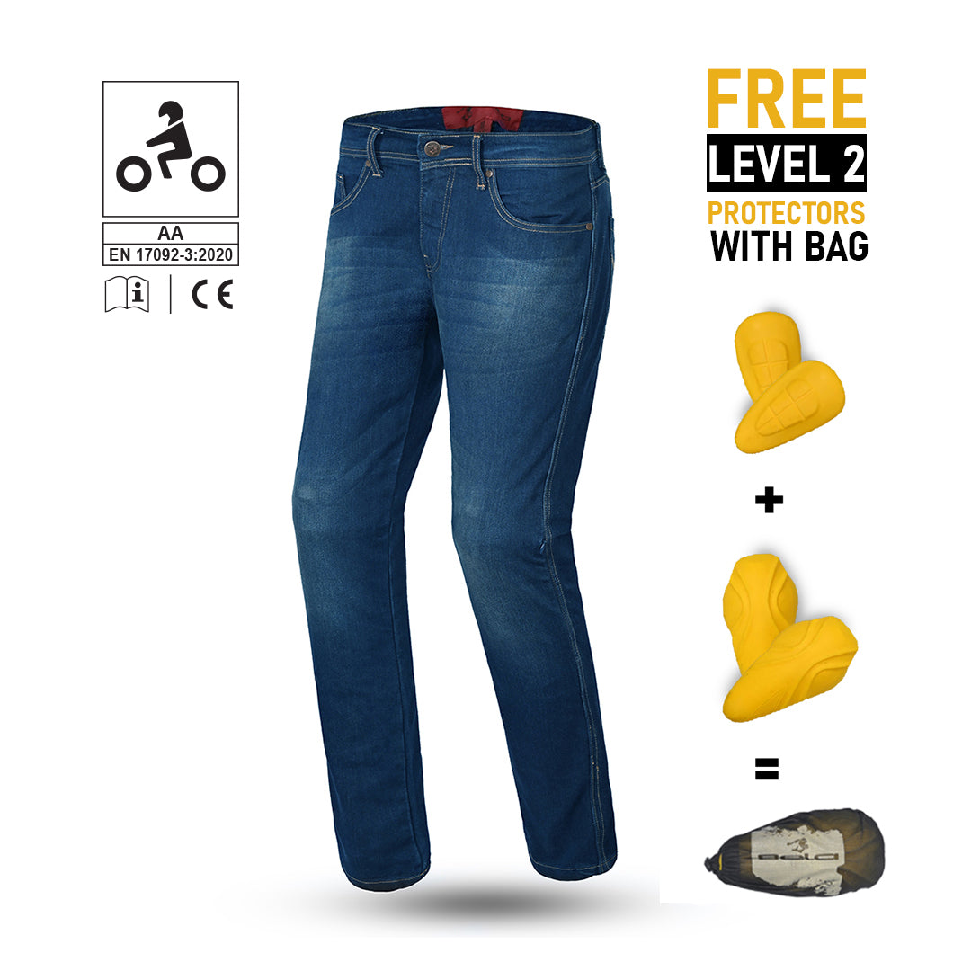 Optimal Weight Distribution: The denim material weighs 1.15 kg, providing a sturdy feel without being too heavy. The integrated protectors add an additional 300 g, bringing the total weight to a balanced 1.45 kg. This optimal weight distribution ensures the jeans remain comfortable to wear for extended periods while offering maximum protection. Precautions: